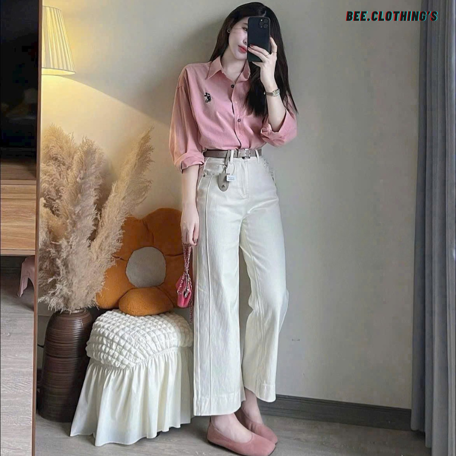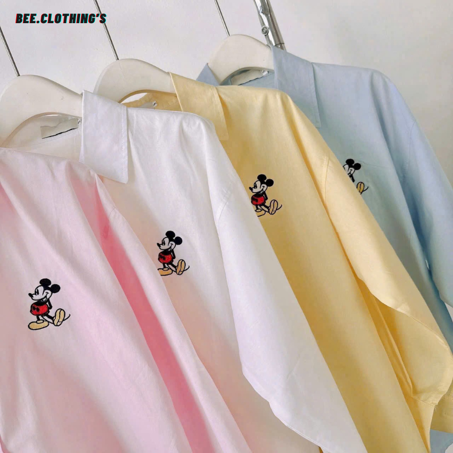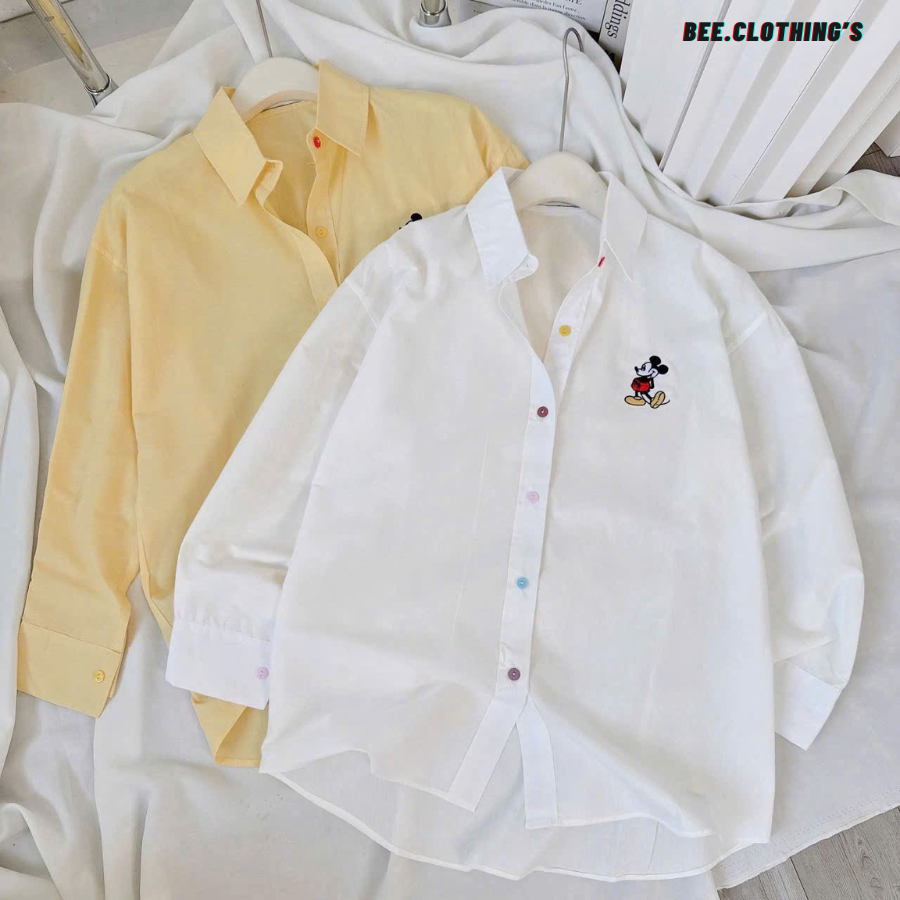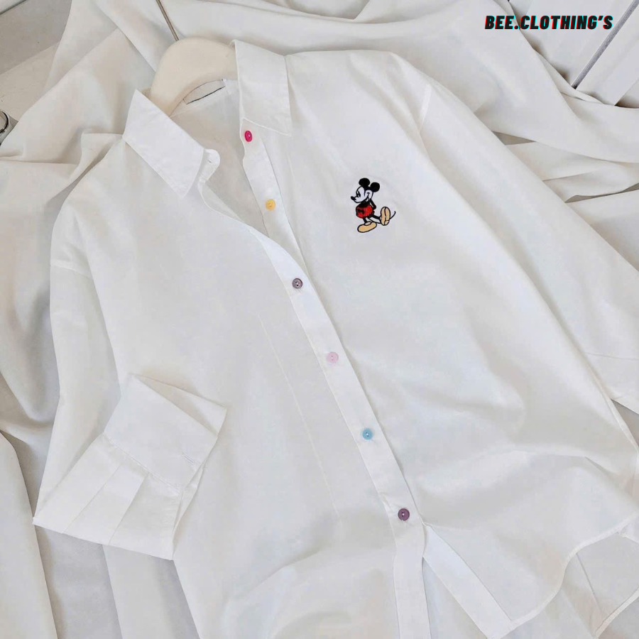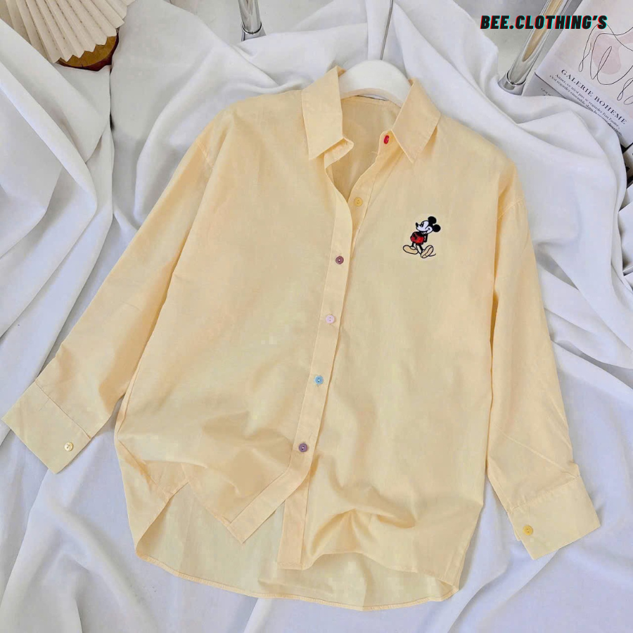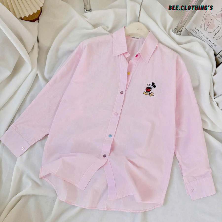 Một thiết kế sơ mi tay dài đáng yêu, nổi bật với họa tiết thêu hình chú chuột hoạt hình sinh động, đi kèm hàng cúc áo phối màu lạ mắt – chiếc áo vừa mang chất học đường dễ thương, vừa giữ nét thanh lịch, cực kỳ dễ phối đồ.