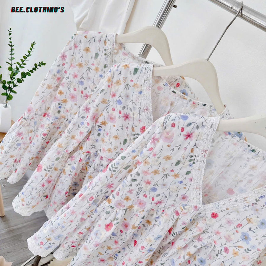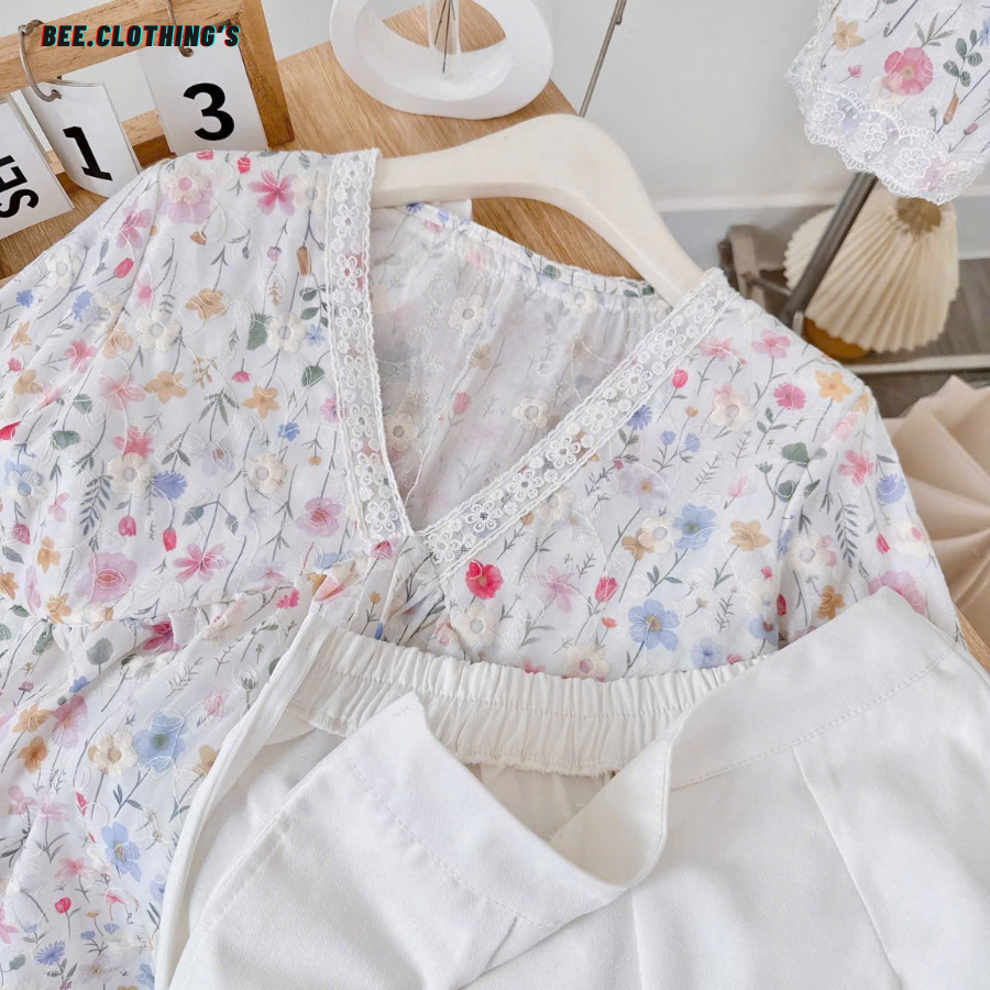 - Áo: Chất liệu xô mềm nhẹ, thấm hút mồ hôi, không nóng bí, thích hợp mặc cả mùa hè. Cổ chữ V nhẹ nhàng, viền ren trắng mảnh tinh tế, tạo điểm nhấn cổ điển, tay áo loe nhẹ, mang lại cảm giác mềm mại và thoáng