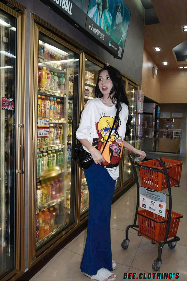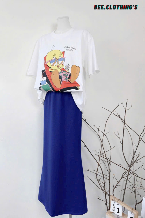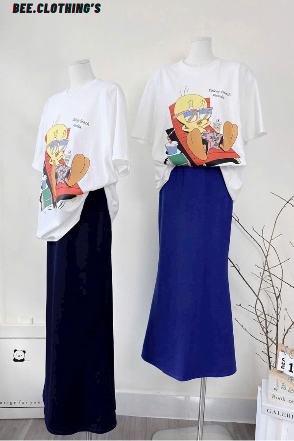 - Chân váy: Dáng xoè nhẹ (loe chữ A), dài qua gối tôn dáng, nữ tính. Lưng thun co giãn dễ mặc, không siết bụng, phù hợp nhiều dáng người.