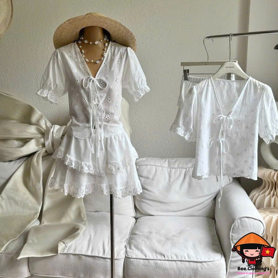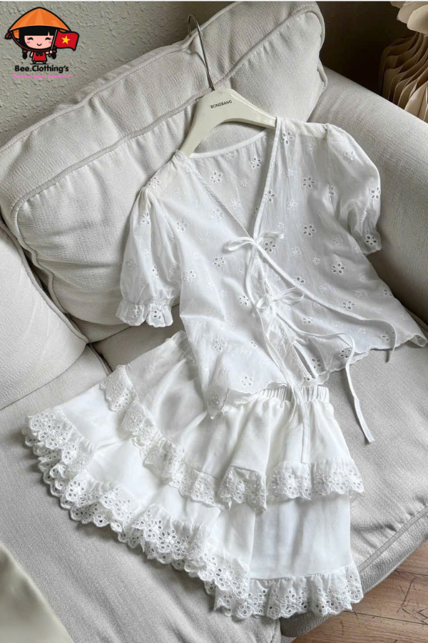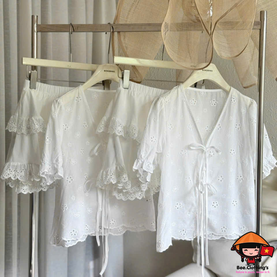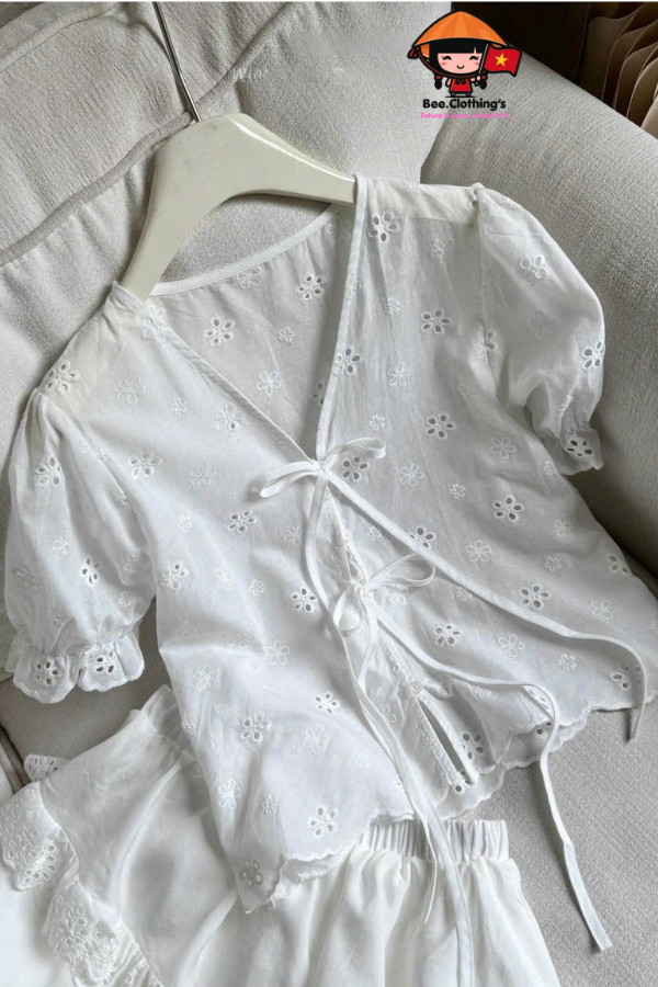- Áo: Vải cotton thêu hoa mềm. Phối nơ thắt dọc giữa trước áo, lai tay nhún thun.