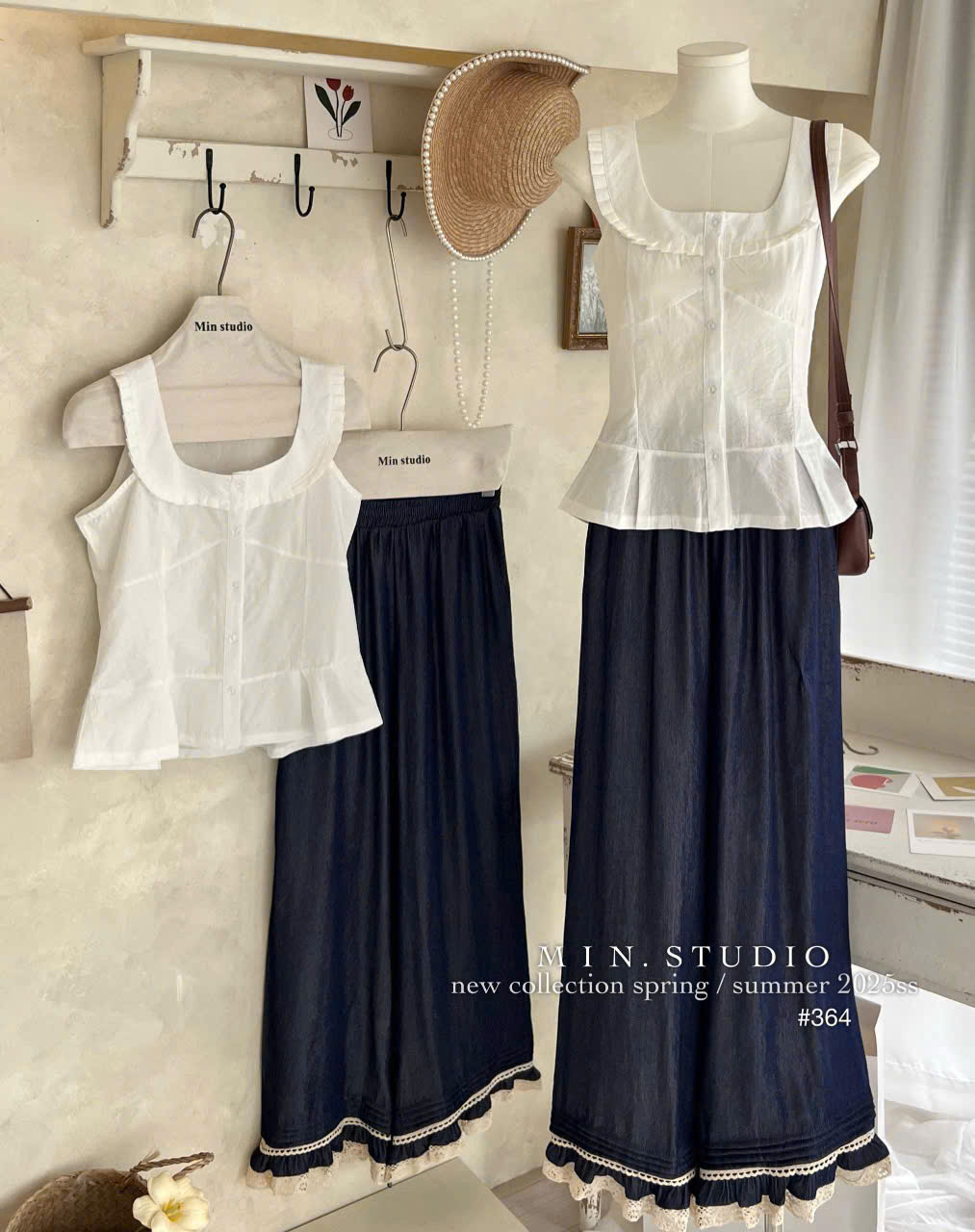 - Quần: Chất vải denim mềm, phối bèo ren. Quần xuông, đứng form, rũ nhẹ khi mặc.