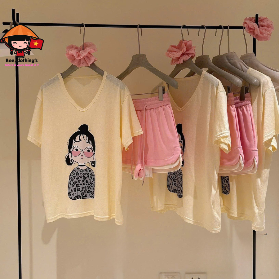 Set đồ có 1 màu duy nhât tone pastel (Áo Kem vs. In x Quần Hồng)