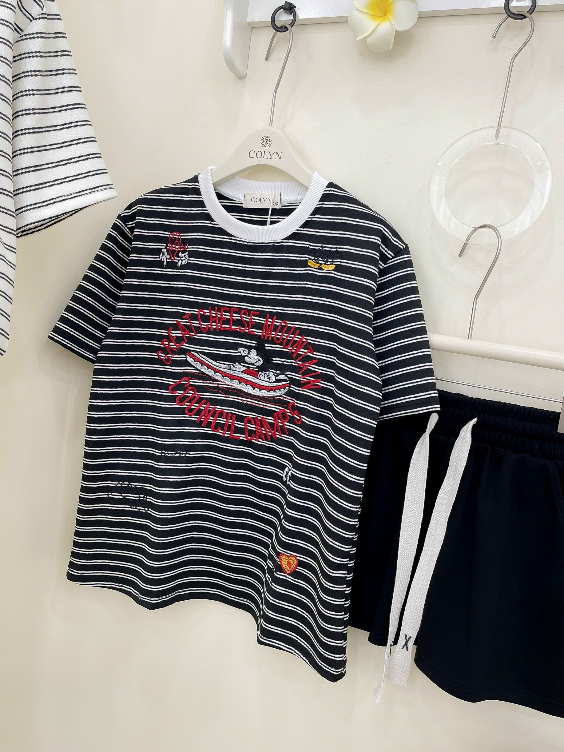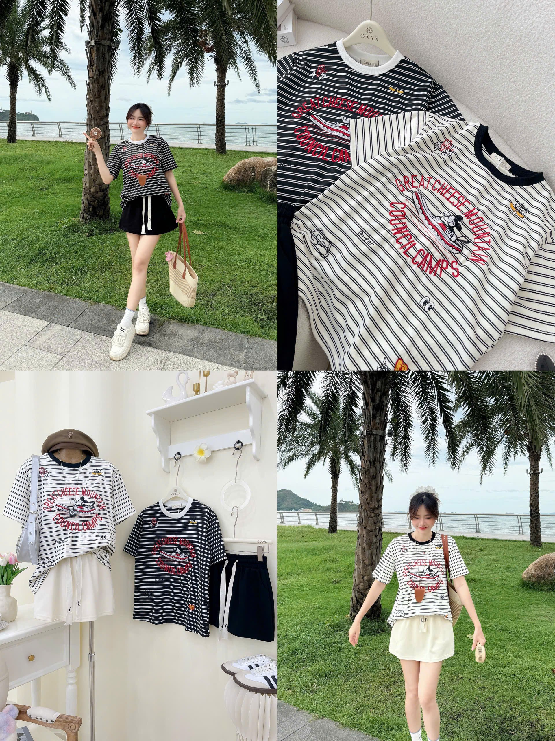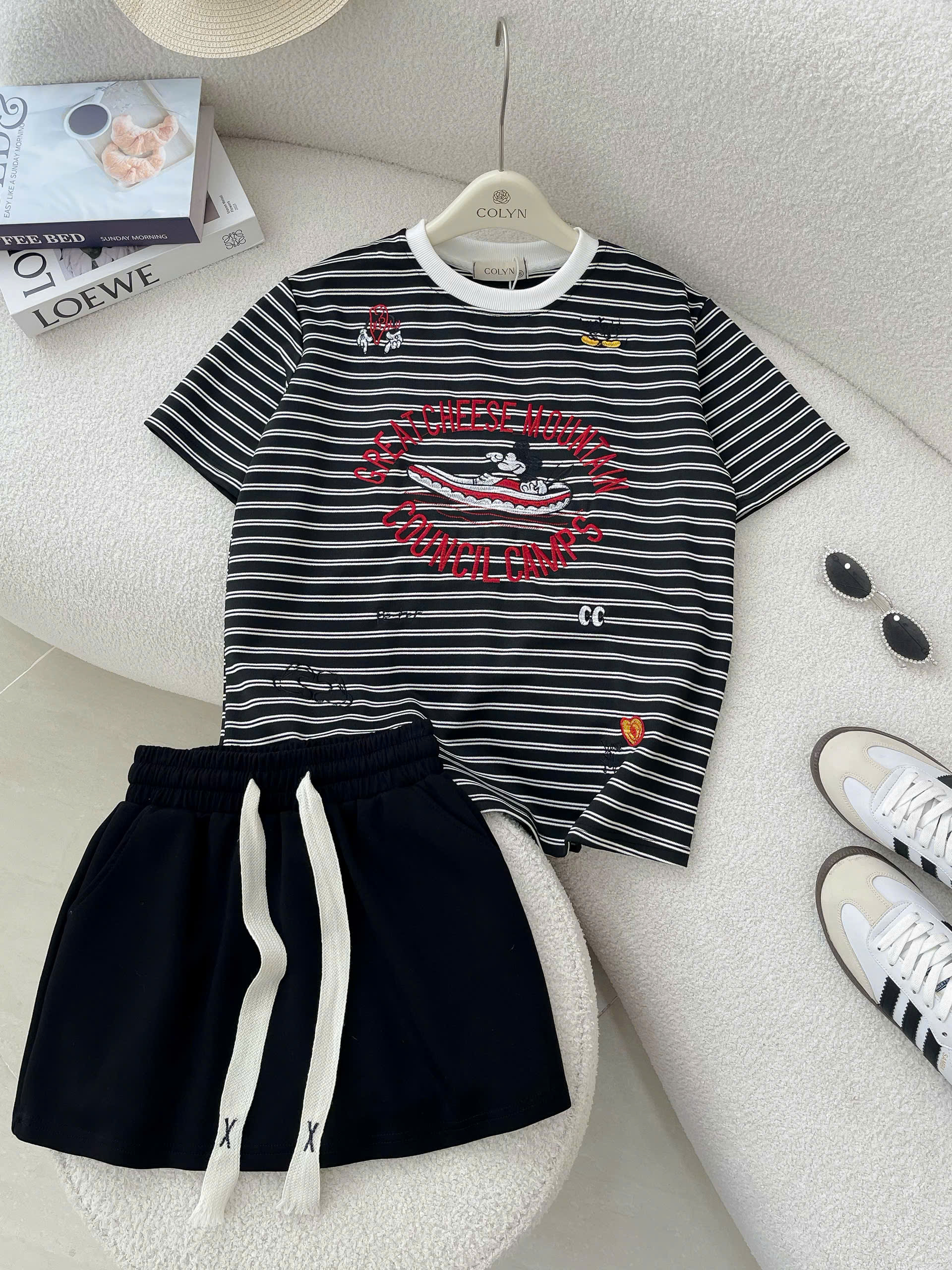 - Áo: Vải rib sọc, co giãn tốt, không kích ứng da khi mặc. Form áo oversize phối rib cổ. Áo thêu toàn bộ thân trước với hình thêu chuột Mickey.
