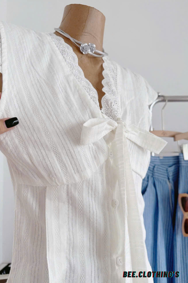 Set đồ chỉ 1 màu duy nhất (Áo xô trắng + Dây nơ trước ngực x Quần suông sọc xanh).